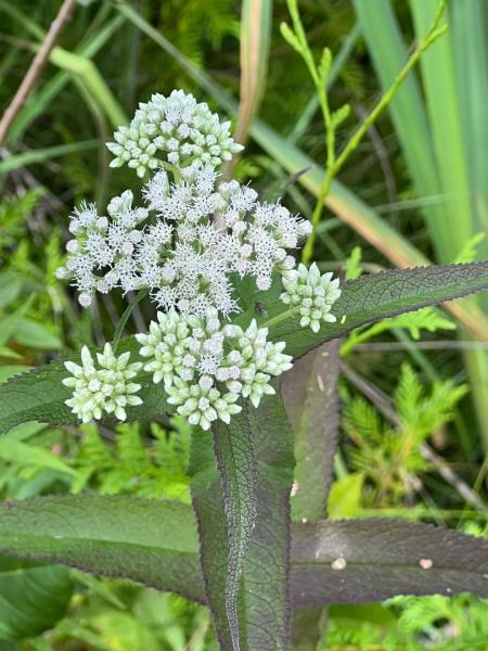 Boneset and Joe Pye Weed growing together; note purplish color of Boneset leaves when young. Photo credit: Jocelyn Carter, Medsin Cup, 2023