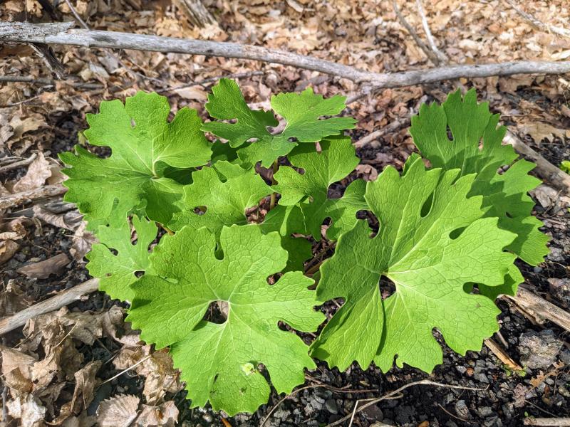 Bloodroot is an herbaceous perennial that is native to Eastern North America. It has a unique leaf unlike any other, being round, deeply lobed and strongly veined. Each above-ground part of the plant has one leaf and one flower that arise on a separate stem, but at first, the leaf completely enwraps the flower. They both arise and unfurl at the same time, and so sometimes the flower opens before the leaf is completely unfurled. The clear white flower has many petals, and a golden orange center; the flower and leaf open with the sun, and close at nighttime. Like other members of the Papaveraceae family, Bloodroot exudes interesting sap, after which this plant is named. The underground stem and root contain red “juice” which exudes when lacerated or broken, so it appears the plant is “bleeding.” Sanguinaria means “bleeding.” Bloodroot grows in undisturbed mixed hardwood mesic forests, on floodplains, and on slopes near streams, rivers, and ponds. Bloodroot prefers rich upland and floodplain orientations, on slopes and in areas with moist to wet soil that is kept that way under layers of deciduous leaf litter.