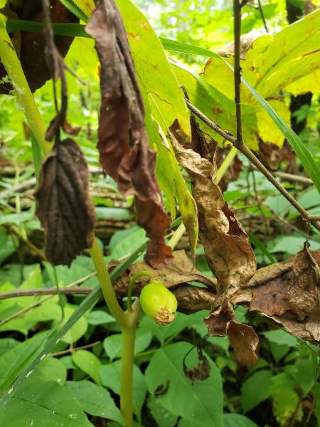Mayapple appears in Frederick Wilkerson Waugh’s notebooks on foods, in the section on wild fruits. It appears from his notebook that Chief David Jack is one of the people who shared the knowledge within. Mayapple is listed as mandrake, to “use as regular food on table raw, not as a preserve” (Waugh, 1912). Contemporary Haudenosaunee knowledge teaches that mayapple fruits are only edible when they are ripe and yellow, usually in July or August. This dovetails with Waugh’s notes, which records that mandrakes were sometimes “gathered, covered with dirt and left for a week or two, when they became ripe.” Waugh also recorded that Peter John advised him to make a decoction of the leaves and soak corn seeds in it, to help them begin to germinate and prevent birds and insects from eating the seeds.