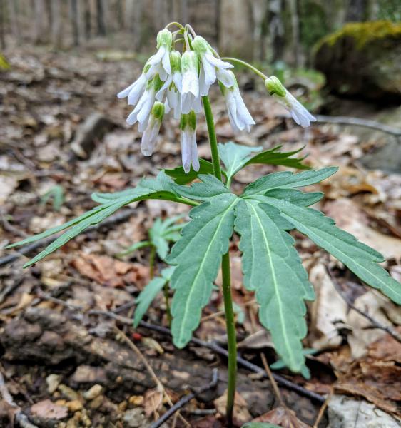 Pepper root is a member of the bittercress genus (formerly Dentaria), and Brassicaceae, the mustard and cabbage family. The roots are connected through runners that extend indefinitely through rhizomes and stolon. The name of the root toothwort refers to toothlike protrusions of the root where it meets the stem. This hardy, evergreen plant then goes dormant through the summer until the fall, when it begins a second growth period and persists through the winter. The leaves have toothy margins that appear palmate in clusters of 3-5 leaflets on each of the two leaf stems. The leaves are compound with 3 oval shaped leaflets attached with very short leafstalks. Pepper root has a similar-looking edible cousin, Cardamine concatenata, the cut-leaved toothwort. Cut-leaved toothwort leaves are slender and deeply lobed in appearance, and are arranged around the stem in a whorl. This Native plant that is endemic to Eastern North America grows in rich, damp woods and meadows. It grows on slopes, out of leaf litter, in partial or dappled shade, but does not grow under the deep shade of fir trees. Pepper root prefers growing in leaf litter from deciduous trees, is dormant during the summer, and then active in the fall and winter. Pepper root grows on rich, moderately moist soils in woods and woodland edges, cliffs, bluffs, ledges, shaded slopes, meadows, stream banks and swampy areas.