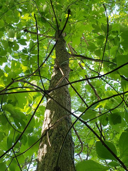 Sassafras albidum tree growing in Connecticut, showing bark and twig morphology, gestalt; photo credit J. Dolan, 2019
