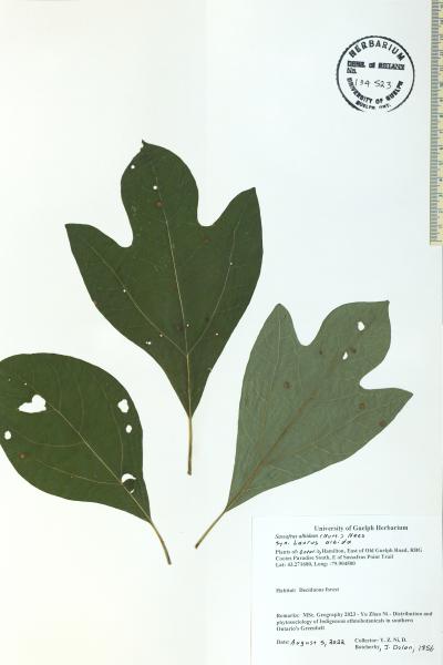 Sassafras albidum specimen collected by Y. Z. Ni, D. Botcherby, and J. Dolan in Cootes Paradise, Hamilton, 2022