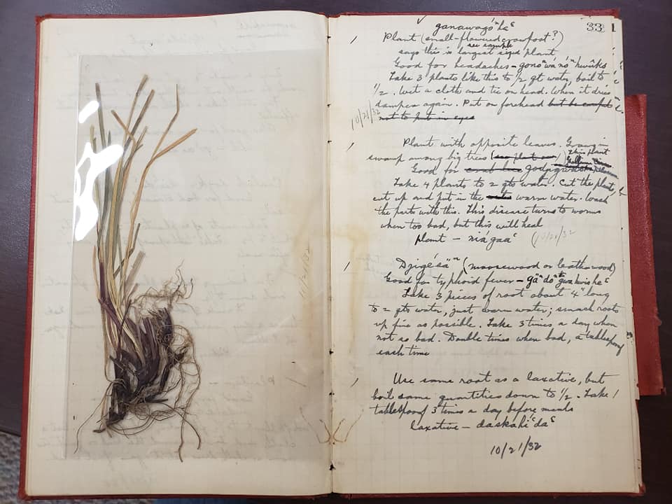 Cultural Research Methods: The cultural and ethnobotanical research on this project are designed by incorporating methods from ethnobiology, Indigenous research in museums and archives, and applied Indigenous environmental studies. Dr. Jessica Dolan first created a baseline historical dataset of from the archives of the Frederick Wilkerson Waugh collections at the Canada Museum of History, found here: https://www.historymuseum.ca/cmc/exhibitions/tresors/ethno/etp0900e.html. The Canadian Geologic Survey hired F. W. Waugh to research lifeways of Haudenosaunee and Anishinaabek communities between 1911 and 1924. His archives at the museum are extensive; F. W. Waugh collected thousands of pages of written notes from Haudenosaunee, Anishinaabek, Innu, Inuit, and other Indigenous peoples, along with taking photographic portraits of them, and purchasing artifacts. His notebooks are full of sketches of the Indigenous sciences and knowledge systems he was studying, as well as pressed plant leaves, and notes in the Indigenous languages he was studying.