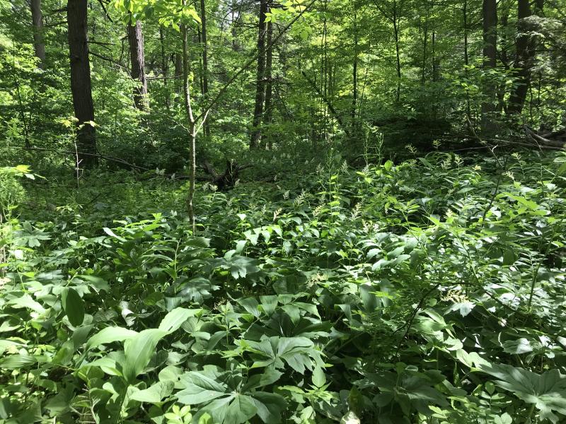 Beamer Memorial Conservation Area lies firmly in the Carolinian forest zone and is composed of rich deciduous and mixed-wood forests. On top of the Escarpment, on level ground before the cliff face, sugar maple dominates the forest canopy, interspersed with red oaks, basswood, ironwood, and black cherry. Common understory trees and shrubs include hawthorns, dogwoods, roses, raspberries and chokecherry, and vines such as grapevine, honeysuckles, Virginia creeper, and poison ivy. Ground-level herbaceous vegetation is diverse, with both native species, such as trout-lily, bloodroot, jack-in-the-pulpit, cleavers, woodland strawberry, and Canada mayflower, and exotic species, such as garlic mustard, Herb Robert, and dandelion. In wetter areas, walnut and hickories prevail in the canopy, and are joined with moisture loving herbaceous species, such as jewelweed and sensitive fern.