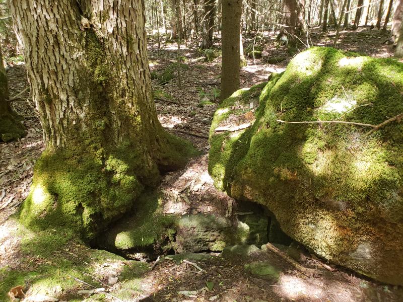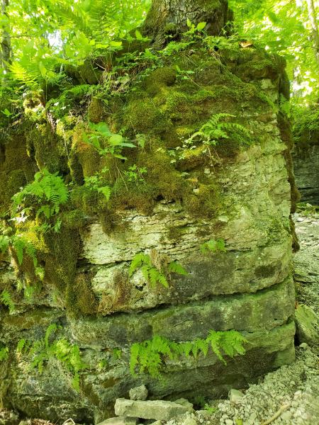 The main Bruce trail winds through forests littered with dolostone boulders, crevices and caves. The stones are often lushly covered with carpets of moss, but where the dolostone rocks are exposed, visitors can find fossils from marine species including corals and stromatolites (large colonies of microbes) from the Ordovician to Silurian periods of geologic history.