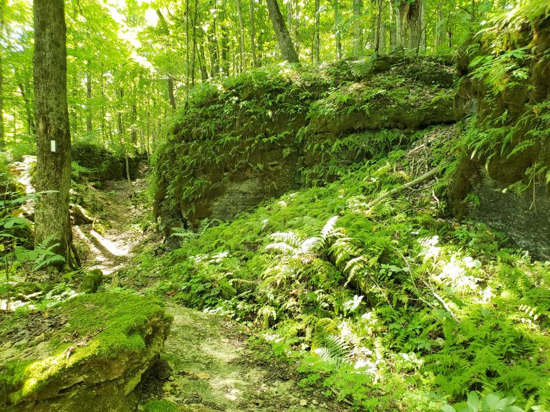 Fossil Glen hosts deciduous and mixed wood forests in various stages of succession, from young to nearing old growth. Younger forests are located close to the trail head, and are composed of dense, young sugar maple trees interspersed with ash saplings and cedar trees, and a couple of individual mature maples trees. This age structure is typical of regrowth following agricultural abandonment. The ground cover in these young forests are not very diverse, and consist of seedlings of hawthorns and canopy species, as well as sedges and dandelions. More mature forests occur further up the Bruce trail, and consist of larger sugar maples interspersed with cedar, balsam fir, ironwood, paper birch, red oak, and basswood, with the shrub layer containing saplings of these same species, as well as dogbane. These forests occur on thin soil over loose dolostone bedrock, and are accompanied by a diversity of herbaceous species such as Canada mayflower, helleborine orchids, sarsaparilla, trilliums, sedges, asters, goldenrods, ramps, and Solomon’s seal, demonstrating a range of plant and tree species that are culturally important Anishinaabe ethnobotanicals. In addition, an abundance of ferns, including northern holly fern, spinulose wood fern, and marginal wood fern, cover the forest floor.