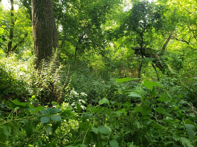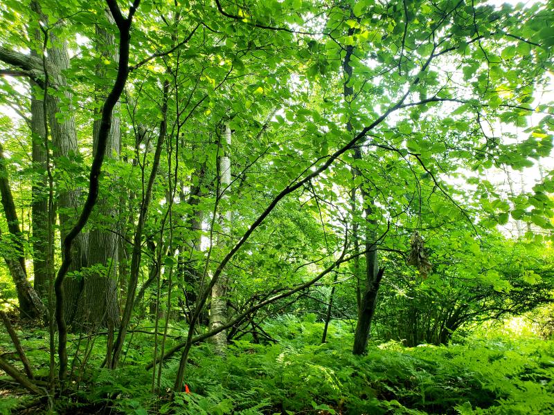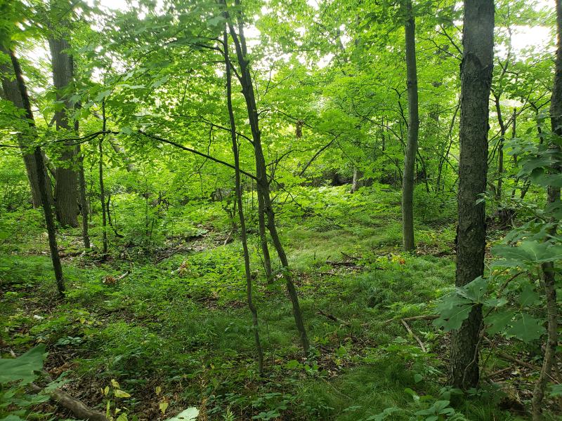 The land surrounding the bog is composed of deciduous forest. The southern tip of the nature reserve is home to lowland forests composed of Manitoba maple and black walnut, with a thick buckthorn and chokecherry shrub layer. Much of the understory of these forests is dominated by garlic mustard. The north end is composed of rich Carolinian forest dominated by red maple in the canopy, interspersed with musclewood, black cherry, paper birch and red oak. The shrub layer is abundant in witch-hazel, chokecherry, and honeysuckles, and also the occasional wild blueberry. The herbaceous layer is diverse, and include both native species, such as Canada mayflower, mayapple, sarsaparilla, Saint John’s wort, wintergreen, trilliums, Christmas fern, white baneberry, white snakeroot, motherwort, and greenbrier, and exotic species such as speedwell, herb Robert, and wood avens.