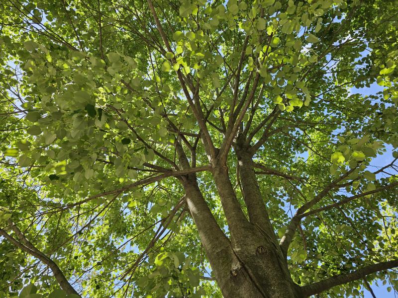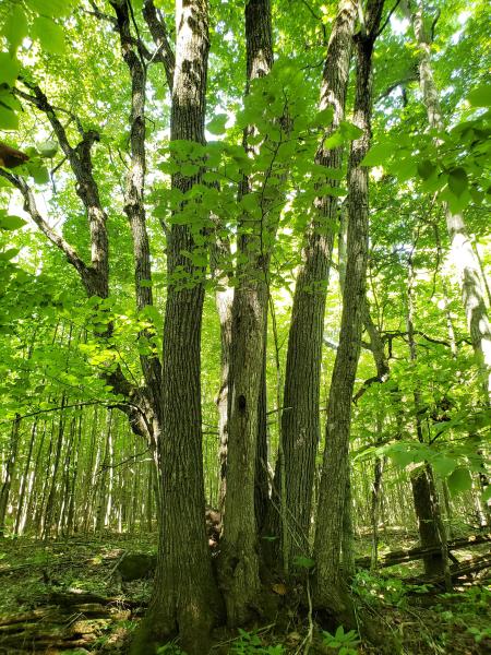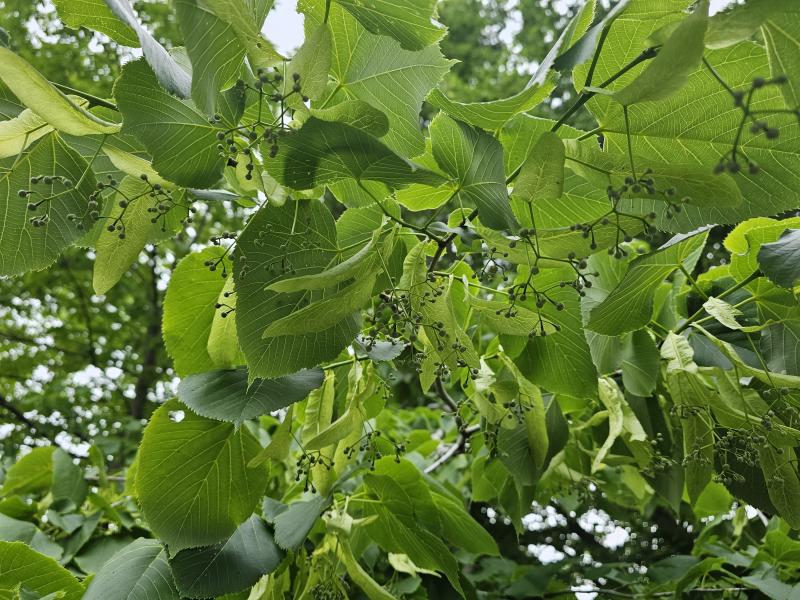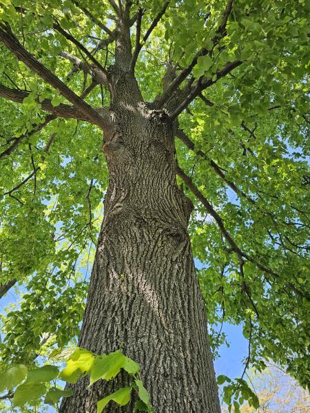Basswood trees in various stages of growth. Note the long bracts that subtend the flowers and fruiting clusters. Basswood bark can be smoother when the tree is younger, growing furrows as the tree ages. Basswood trees can be quite large with a singular trunk, and branches that begin high up towards the crown; or, they can have multiple trunks from coppicing or other environmental effects on the tree. Photo credits: J. Dolan, 2022 - 24