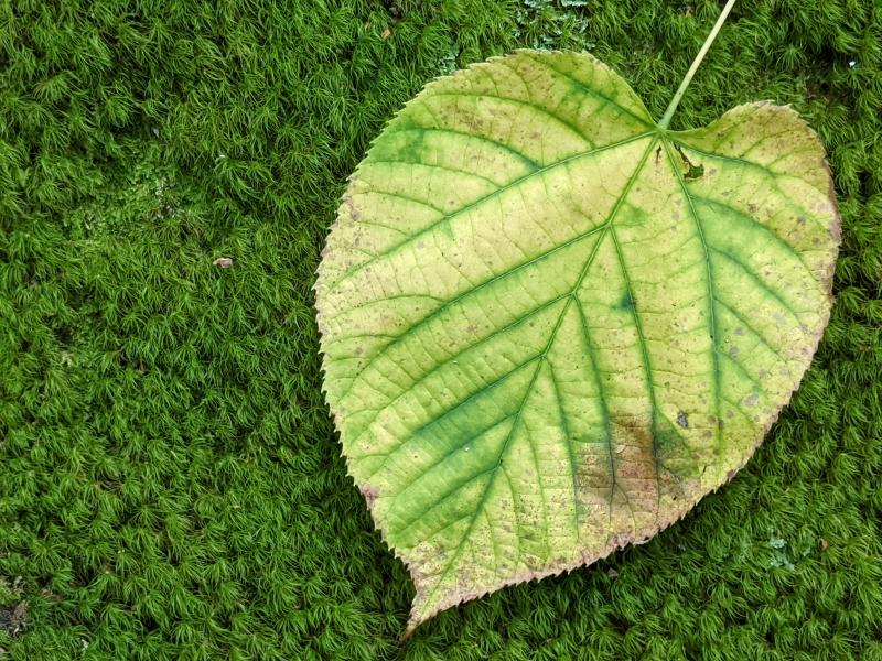 A large basswood leaf, showing shape and venation, photo credit: Bat Cave Botanicals 2022