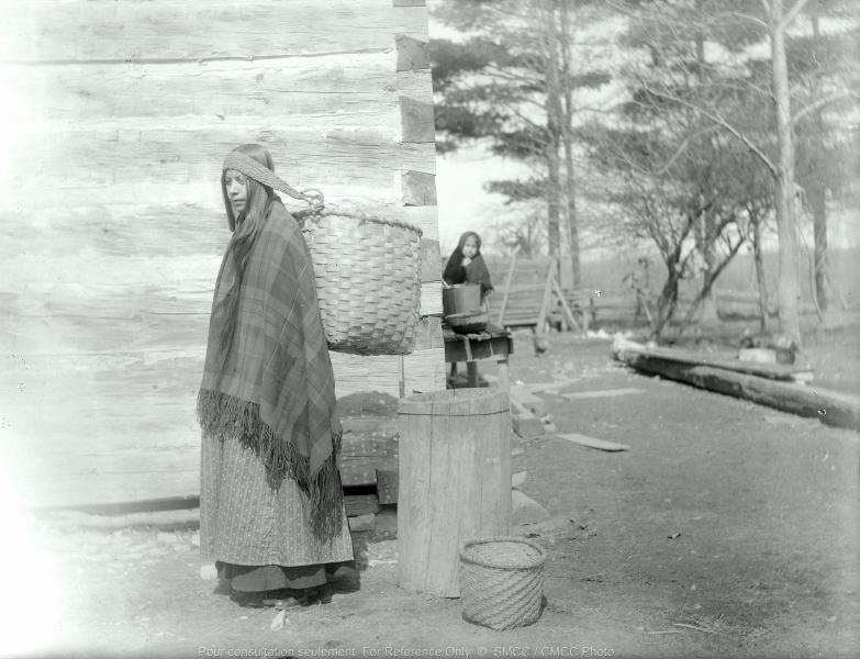Mary Johnson carrying a basket, Six Nations of the Grand River, Ontario. The tumpline is made of Basswood inner bark. Photo credit: Frederick Wilkerson Waugh, 1912, Canadian Museum of History.