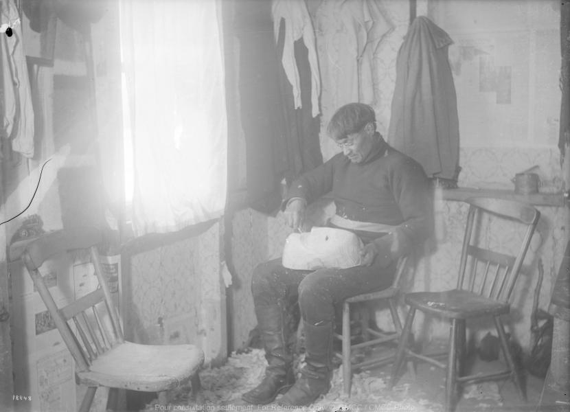 Chief David Key carving a mask from Basswood (demonstration photo, not ceremonial), Six Nations of the Grand River, Photo credit: Frederick Wilkerson Waugh, 1912, Canadian Museum of History.