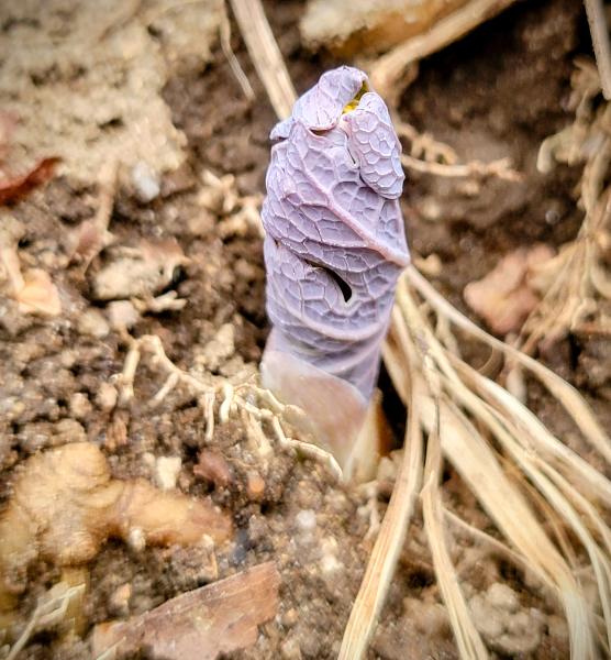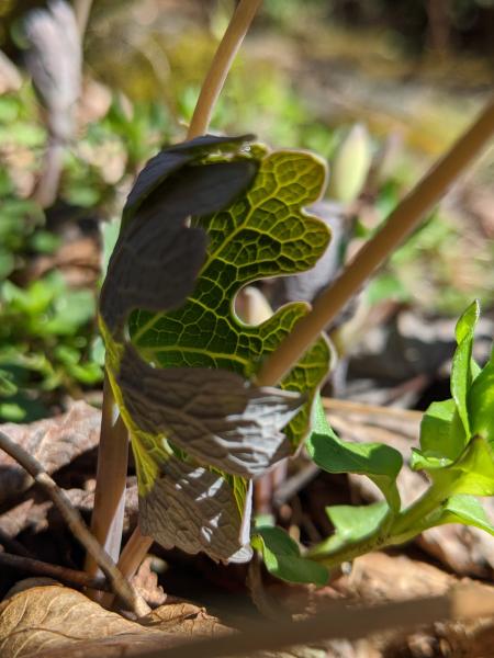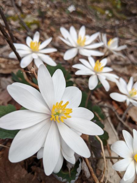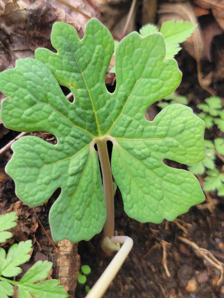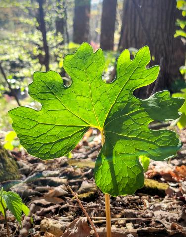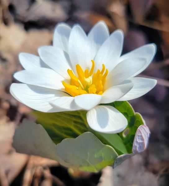 Bloodroot is an herbaceous perennial that is native to Eastern North America. It has a unique leaf unlike any other, being round, deeply lobed and strongly veined. Each above-ground part of the plant has one leaf and one flower that arise on a separate stem, but at first, the leaf completely enwraps the flower. They both arise and unfurl at the same time, and so sometimes the flower opens before the leaf is completely unfurled. The clear white flower has many petals, and a golden orange center; the flower and leaf open with the sun, and close at nighttime. Like other members of the Papaveraceae family, Bloodroot exudes interesting sap, after which this plant is named. The underground stem and root contain red “juice” which exudes when lacerated or broken, so it appears the plant is “bleeding.” Sanguinaria means “bleeding.” Bloodroot grows in undisturbed mixed hardwood mesic forests, on floodplains, and on slopes near streams, rivers, and ponds. Bloodroot prefers rich upland and floodplain orientations, on slopes and in areas with moist to wet soil that is kept that way under layers of deciduous leaf litter.