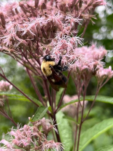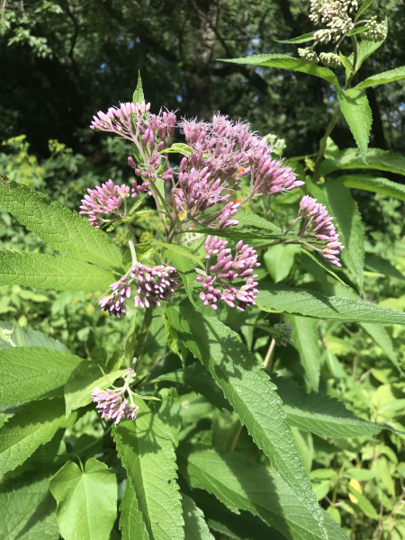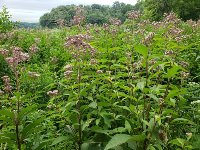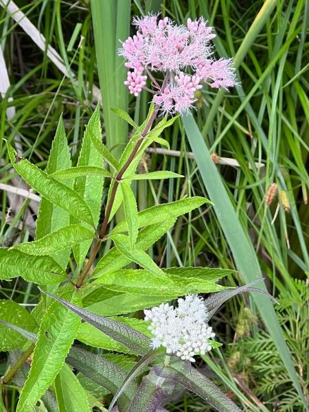 Boneset and Joe Pye Weed growing together; note purplish color of Boneset leaves when young. Photo credit: Jocelyn Carter, Medsin Cup, 2023