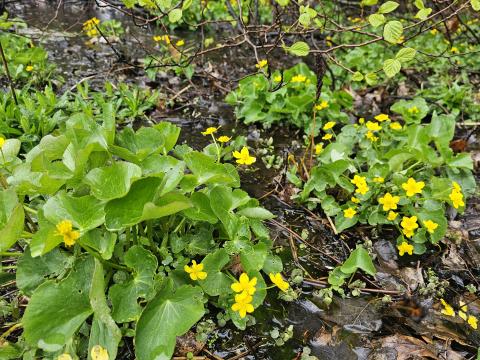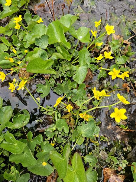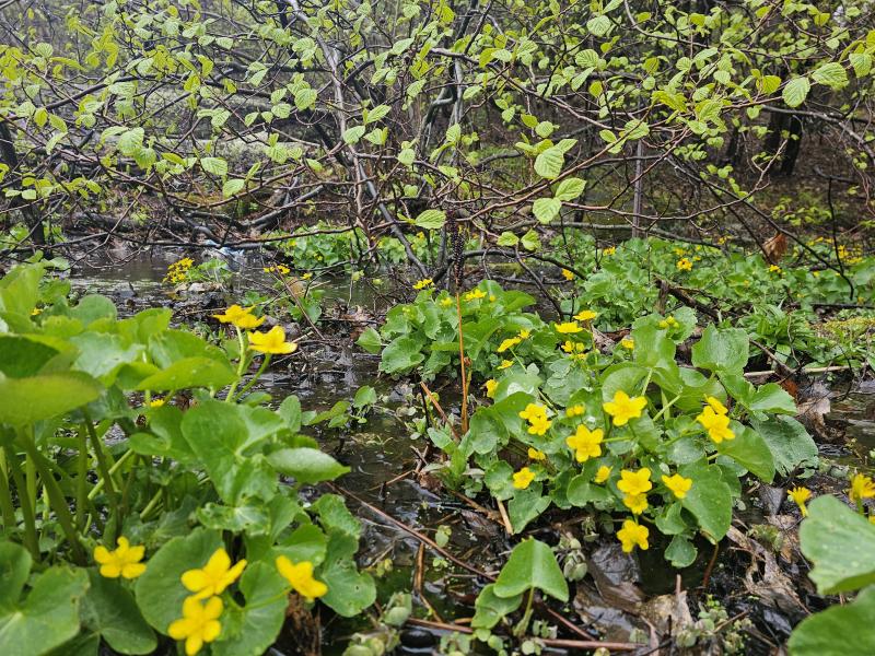 Marsh marigolds blooming in their preferred environment – a wet marshy area beside a meadow. Note that they form multiple round plant clusters in a community, rather than spreading into a mat, as one of their more aggressive exotic look-alike cousins, Lesser Celandine, does. Photo credits: J. Dolan 2024
