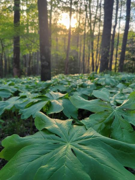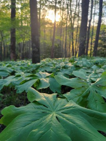 Mayapple growing in the forest. Photo credit: Bat Cave Botanicals, 2022