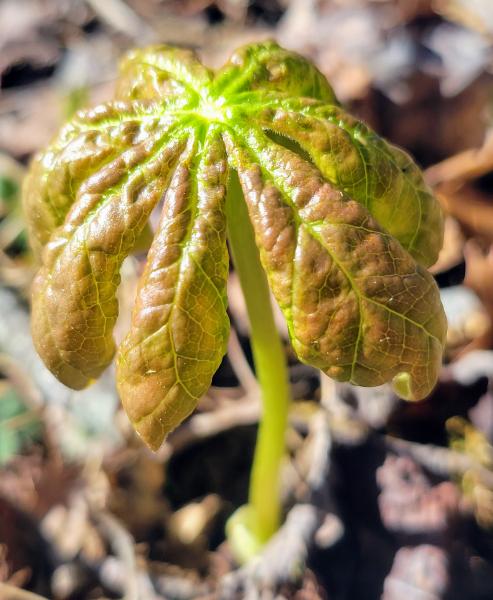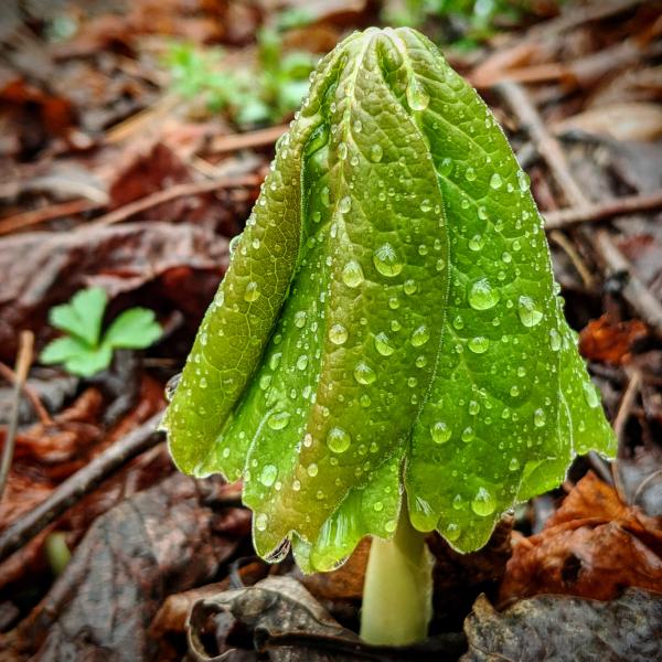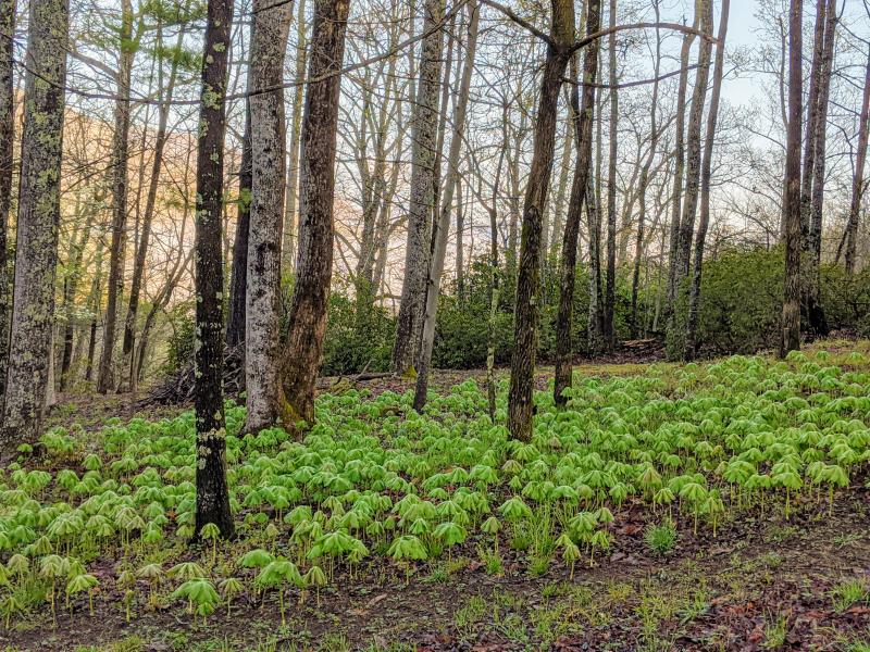 Mayapples rise up and their leaves open like little umbrellas in the springtime, Photo credit: Bat Cave Botanicals, 2022