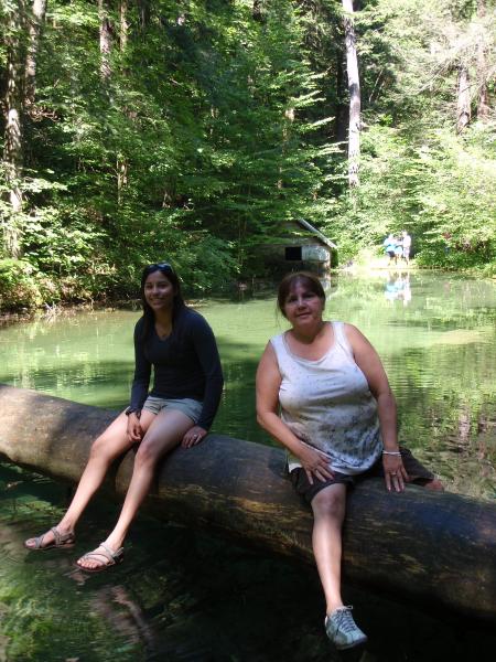 Terrylynn Serasera Brant and her daughter Jesse Yonenyákenht Brant at the spring in Kanatsiohareke, summer 2011, where we noted there were very large mayapples growing in the forest! Photo credit J. Dolan 2011