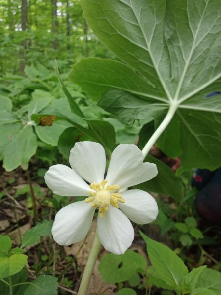 Mayapple is a perennial herb with opposite leaves arising directly from the rhizome. The leaves are palmately lobed, with 3-9 deep lobes, and lobe margins coarsely toothed. Flowers are solitary and arise between two leaves. The bisexual flowers are white or pink and occur in 6-9 parts. The fruit is a yellow or red berry. May-apple also reproduces vegetatively by spreading rhizomes. This is a shade tolerant species, and forms part of the understory community in mid to late successional forests.