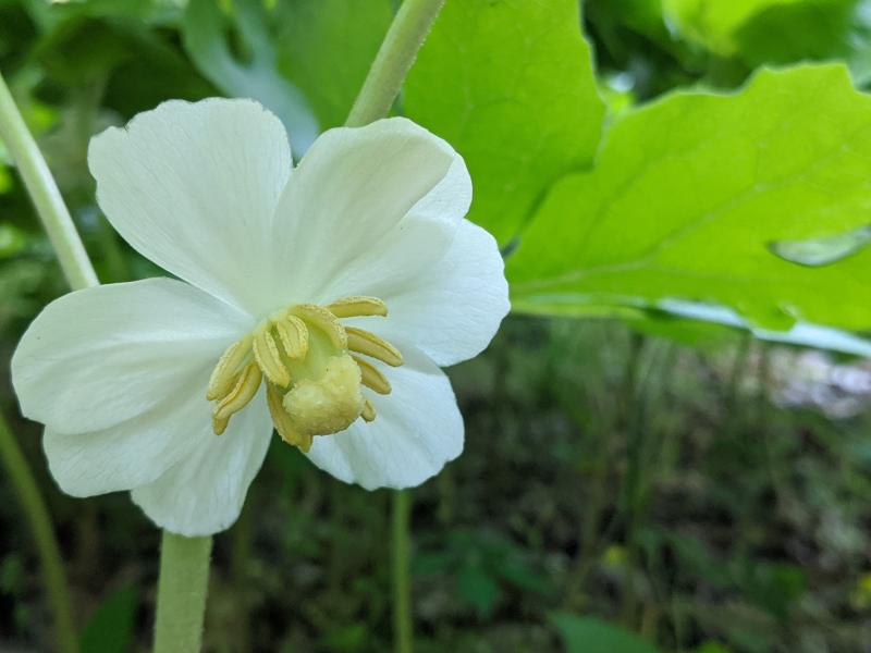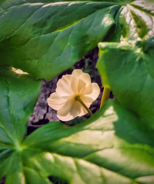 Mayapple flower arising at the base of the two leaves, photo credit Mia Yuzhao Ni and David Botcherby, 2022