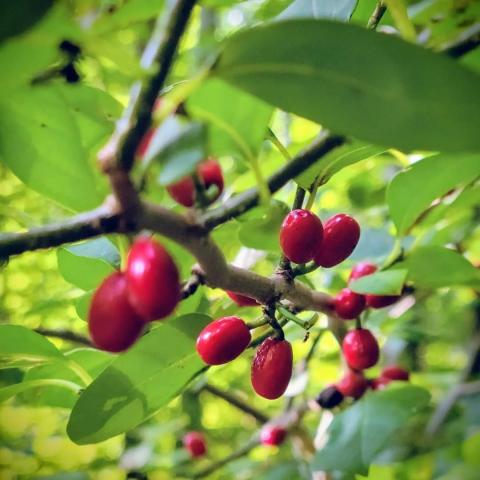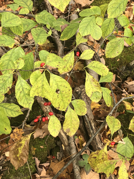 Spicebush berries and leaves, photo credit Bat Cave Botanicals 2022
