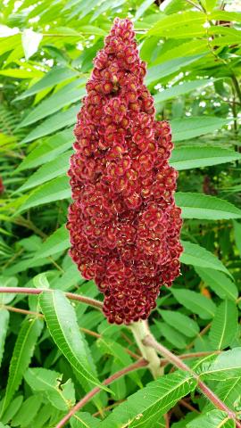 Staghorn Sumac gets its name to the fuzziness of the deciduous branches and stems, which resemble the fuzzy antlers of stags. Also known as Lemonade Tree, this plant is most widely known as a source of sumac “lemonade” or tea, which is rich in Vitamin C and antioxidant activity, and tastes like lemonade. Catkins are collected when they are at their brightest color, crushed off the stem, and a cold infusion is made in the refrigerator, which then gets strained of the tiny hairs and berries before drinking. Sumac is prepared as a hot tea as well, used as a gargle or beverage for sore throat; it has antiseptic and astringent qualities. Sumac twigs have been used as spigots taps for Maple tree tapping. The leaves have been used in a smoking mixture along with Tobacco, Bearberry and Alternate-leaved dogwood.