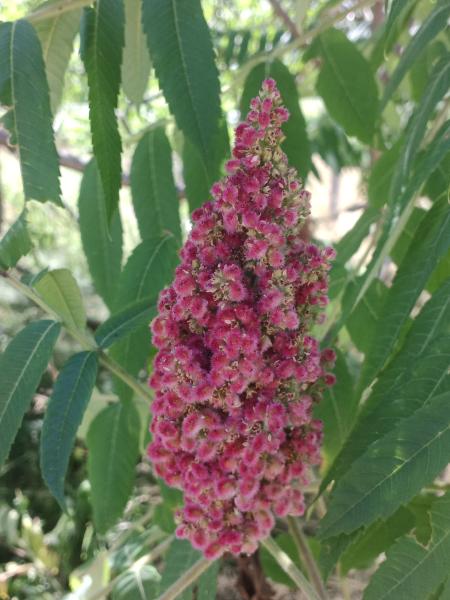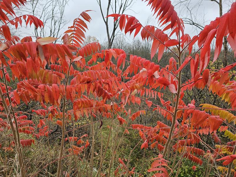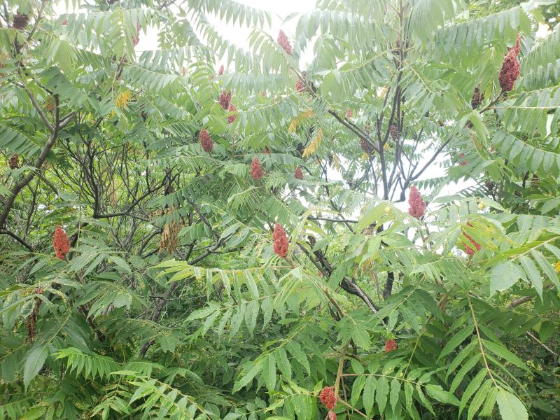A large, dioecious shrub to small tree growing up to 14 m (25- 30 feet), that often grows in wide stands. The bark is thin and smooth, with young twigs densely hairy. The deciduous leaves are alternate and pinnately compound. The leaflets are teethed along the margins, darkly green above and pale green below, turning to bright reds, oranges, purples, and yellows in the autumn. The greenish-yellow flowers grow in terminal clusters, with male and female flowers occurring on separate plants. The fruit is a red drupe covered with hairs that stands upright, called a catkin. Staghorn sumac likes fertile, sunny upland sites, occurring in open fields, forest edges and clearings, and open woods. The fruits ripen from August to September.