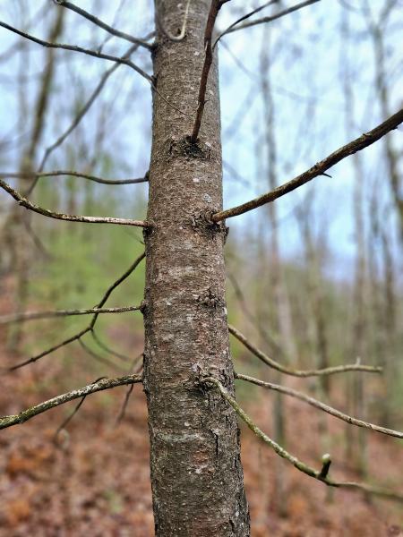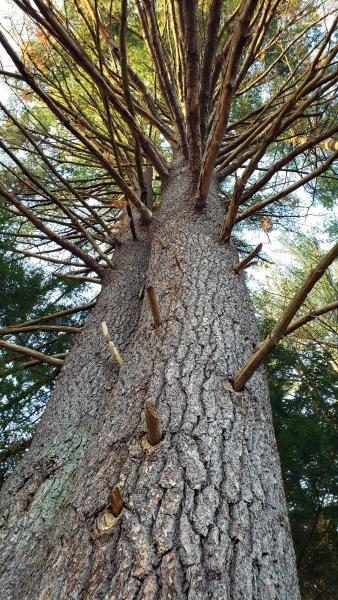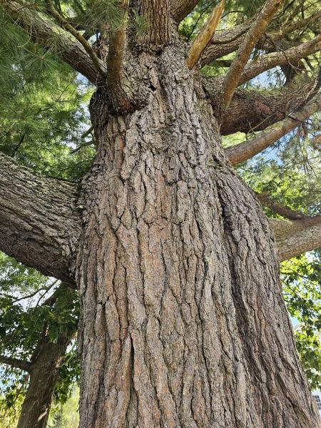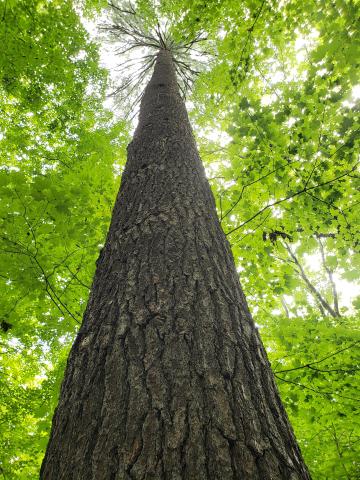 White pine is a tall tree that grows up to between 100 and 230 feet. Mature bark is dark grayish brown, thick, and deeply furrowed; when the tree is younger, the bark is smoother and dark grayish brown with a purplish red tinge. The branches are whorled, spreading and upswept and trees are conical in shape; as each tree grows and ages, branches break off at the bottom, sending the conical shape of the tree upwards to become a rounded or somewhat flattened crown, which then often becomes asymmetrical with the effects of wind. The evergreen needles are pale to deep green or bluish green, soft and flexible, also whorled around the stem, growing in bundles of 5. White pine occurs in light sandy to heavily textured soils in moist to dry sites, including mixed and conifer forests and old fields. They tolerate shade when young, but grow to be the tallest trees in the forest.