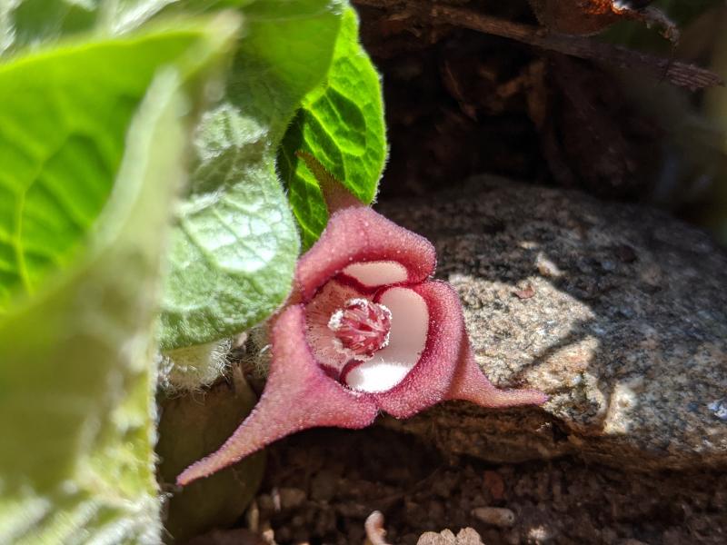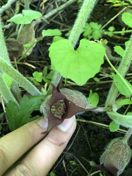 Wild ginger is one of the herbaceous spring ephemeral plants that emerge early, along with mayapple, trillium, trout lily, bloodroot, hepaticas, and jack in the pulpit. It is a perennial low growing herb without aerial stems. The leaves emerge from rhizomes in sub-opposite pairs. Wild ginger’s leaves are uniquely heart-shaped to kidney shaped, with deeply cleft bases and pointed tips, apical on the stalk, and the undersides finely hairy. The leaves sit flat, perpendicular to the ground and sky, and glisten in the sunlight. The red-brown flowers are solitary, arising between a pair of leaves, uniquely placed at the base of the plant, by the ground, and flowering from March to July. Wild ginger likes rich, loamy soils, and grows in moist understories of deciduous and mixed forests.