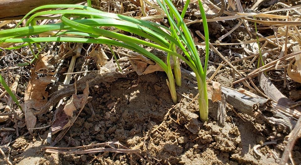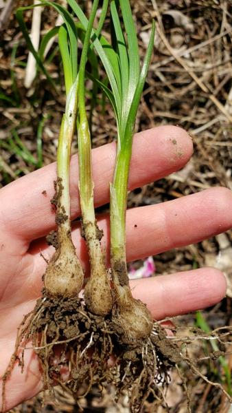 Wild garlic is a naturalized wild Allium that is also an ephemeral in the spring, dying back in the summer, and reproducing underground through bulbs. The leaves are round and hollow, filiform and narrow. The bulbs do not have a net, but a thin papery sheath (like garlic). The bulbs can also grow to be compound, like garlic. Wild garlic grows in anthropogenically disturbed habitat, meadows and fields in clumps.