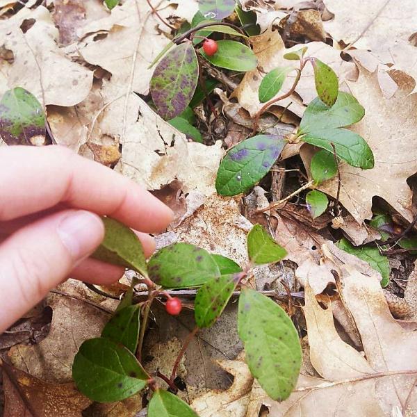 Wintergreen berries and leaves persist throughout the winter, and are available as a food and medicine during times when access to food and medicine may at times be scarce. Photo credit: J. Dolan 2017